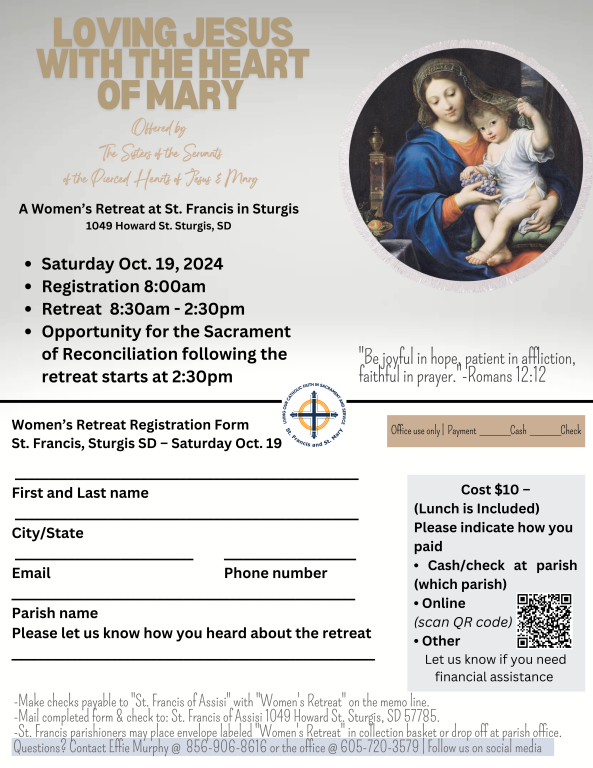 St. Francis is offering a Women's Retreat Saturday, October 19, 2024.